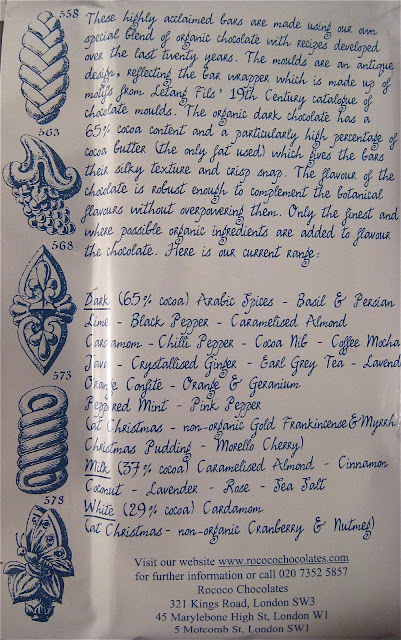 I had my first personal encounter with Rococo Chocolate in the fall of 2006, although I had heard about these organic artisan chocolate bars long before that. Apparently Rococo used to sell their beautiful chocolate at Saks Fifth Avenue here in New York, which is how several of my friends had been able to meet their chocolate needs in the past. But for some inexplicable reason, Rococo terminated their account with Saks by the time I was lusting after their chocolates flavored with such exotic ingredients as sea salt, pink peppercorns and geranium. Nowadays it isn’t so unusual to encounter chocolate infused with herbs and spices or other floral flavors, but this was nearly ten years ago before the esoteric chocolate explosion had hit the States. The London shop wouldn’t export their wares, so short of flying across the pond and descending upon the shop myself, there were years when I had no way to get my hands on this legendary chocolate.